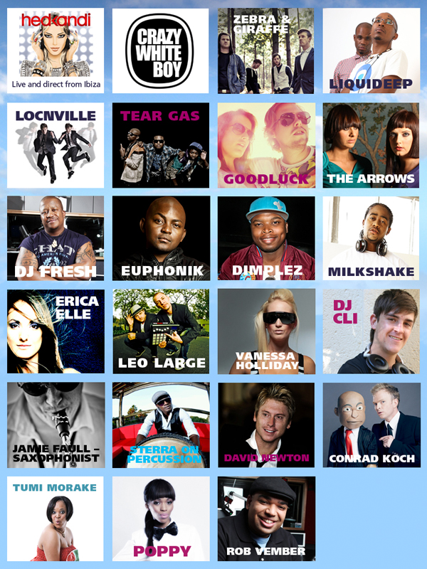 HedKandi (Ibiza), Crazy White Boy, Zebra and Giraffe, Liquideep, Locnville, Tear Gas, Goodluck, The Arrows, DJ Fresh, Euphonik, Dimplez, Milkshake, Erica Elle, Leo Large, Vanessa Holliday, DJ Cli, Jamie Faull –Saxophonist, Sterra on Percussion, David Newton, Conrad Koch, Tumi Morake, POPPY and Rob Vember.  The boat is 13 Storeys of Pure Party – 10 bars, 3 clubs, 4 restaurants, movies, swimming pools, spa and salons, sports, games, shopping, casino, sun deck and internet café.