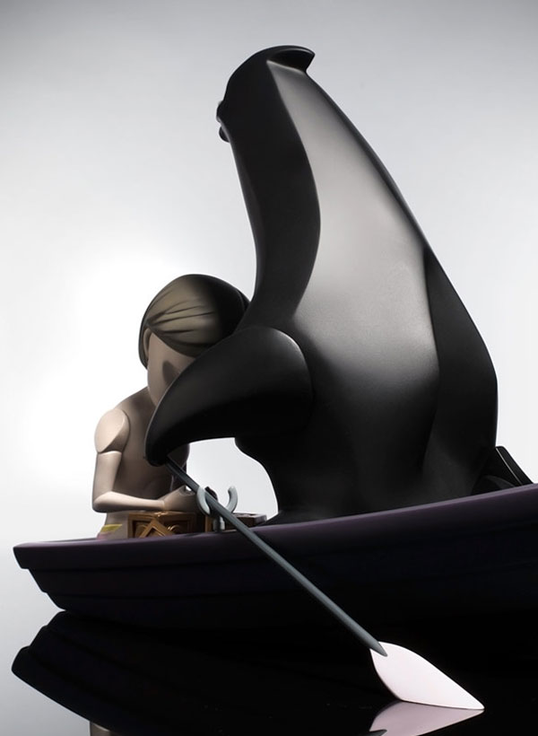 The sculpture catches Ruth, The Void, and Omen in the middle of a journey that will alter the course of all their lives. Having just woken up in her dream, Ruth has made her way through a murky forest, following the false promises of the bird-like omen who pledges he knows a boat that will take her home. Wary but eager to find safety, Ruth boards the rowboat. Little does she know about the frightening creature holding the oars and his plans to take her to a place from which he intends for her to never return.